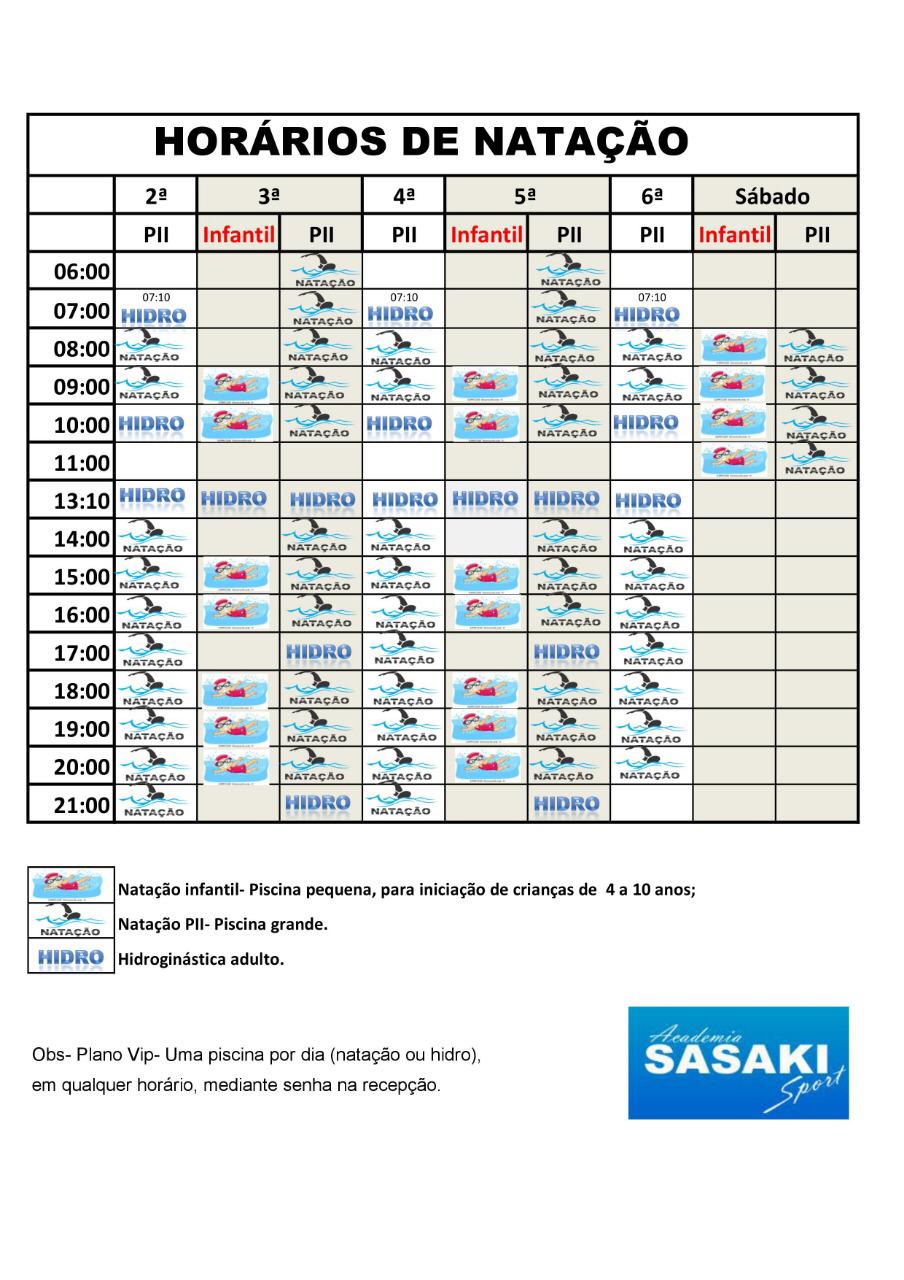 Natação Infantil – Crianças de 4 anos até os 10 anos. Os professores acompanham seu filho sempre de dentro d'água, ensinando toda a adaptação ao meio líquido, desde colocar o rosto na água, flutuação... até o aprendizado dos nados completos. Por fim, as aulas são finalizadas de forma lúdica e recreativa.